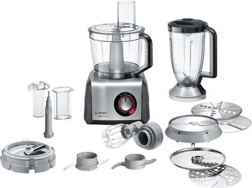 De Bosch MultiTalent 8 MC812M865 is met een behuizing van rvs een solide foodprocessor die je dankzij het vermogen van 1250 watt gebruikt voor het bereiden van verschillende gerechten. Het hoge vermogen maakt deze foodprocessor geschikt voor het kneden van zware degen. Denk hierbij aan brooddeeg of een pizzabodem. Maar je gebruikt deze foodprocessor niet enkel om mee te bakken. Ook hakken, raspen en snijden doet `ie allemaal. Zo beschikt dit model over een snijschijf voor friet, een schijf voor soepgroente en een blokjessnijder voor groente- fruit-, of kaasblokjes. Trek in een lekkere smoothie? Dan klik je het blenderopzetstuk op de foodprocessor. Wanneer je klaar bent mogen de losse onderdelen gewoon in de vaatwasmachine, naar de afwas heb je dus geen omkijken.