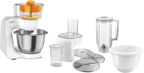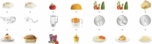 - Antispat deksel, Blender opzetstuk, Citruspers opzetstuk, Extra mengkom, Foodprocessor opzetstuk, Garde, Kneedhaak, Opbergtas voor accessoires, Rasp opzetstuk