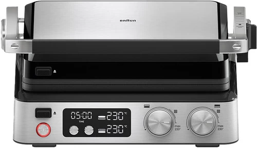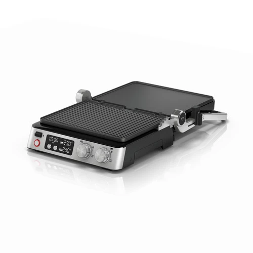 Je stelt de temperatuur van de 2 helften apart van elkaar in, zodat je verschillende ingrediënten tegelijkertijd grilt.