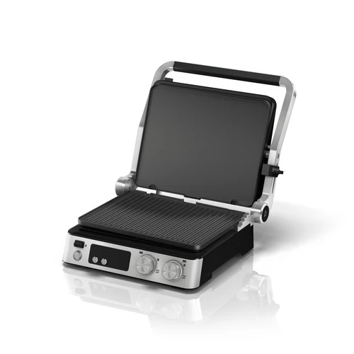 De contactgrill klap je helemaal open, zodat je hem ook als tafelgrill gebruikt.