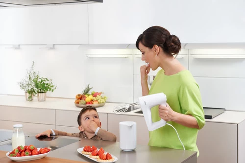 Door het flexibele snoer en de platte achterkant zet je de mixer gemakkelijk even neer.