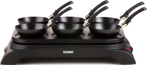 Met de DOMO DO8710W gourmetstel haal je een set in huis waarmee je met een gezin van 6 personen van aan tafel gewokte maaltijden geniet. De kleine pannen zijn door de antiaanbaklaag gemakkelijk schoon te krijgen. Met 1000 watt aan vermogen wordt het onderstel snel heet, waardoor je dus niet lang te wacht voor je bakt. Geen zin om te wokken, maar trek in ouderwetse Hollandse pannenkoeken? Je verwijdert simpelweg alleen de pannetjes en bakt de pannenkoekjes in de handig geïntergreerde bakplaten. Een meegeleverde pollepel maakt het bakken makkelijk.