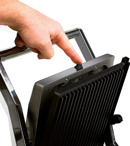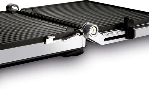 Je klapt de contactgrill helemaal open, zodat je hem ook als tafelgrill gebruikt.