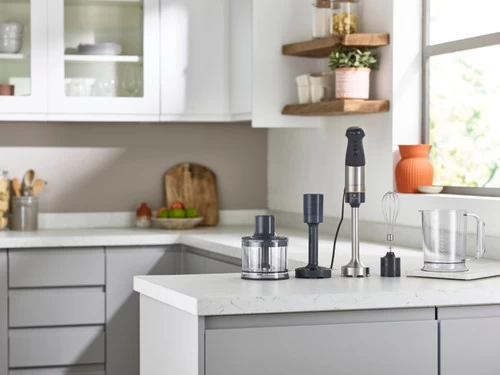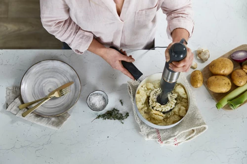 Je maakt zelf aardappelpuree of verse kruiden met de meegeleverde pureerstaaf en hakmolen.