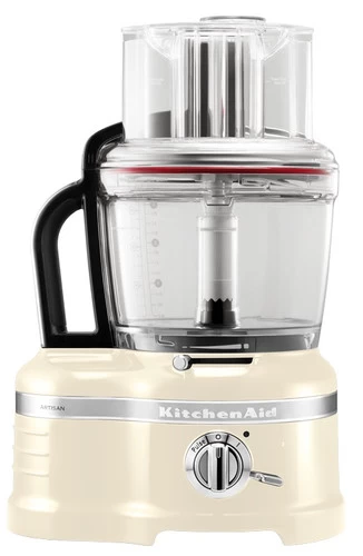 Deze KitchenAid Artisan Foodprocessor Amandelwit van gegoten metaal is robuust, stabiel en duurzaam. Je ontvangt de processor met mengkommen van 4 liter, 2,4 liter en 1 liter die in elkaar passen. De 3-delige toevoerbuis zorgt ervoor dat je aardappelen, courgettes en wortels in z’n geheel snijdt en de snijschijf verstel je gemakkelijk, waardoor je tussen de 1 en 6 millimeter dikte snijdt. Met de blokjeskit maak je snel blokjes groenten, fruit of kaas. Raspen is een fluitje van een cent door de omkeerbare raspschijf voor fijne en grove stukken en de raspschijf voor harde kazen, ijs of chocolade. Met de frietenschijf maak je in een handomdraai zelfgemaakte frieten. Tot de standaard accessoires behoren tevens een citruspers en een eierklopper. Geen zorgen over de opbergmogelijkheden, je ontvangt een opbergbox voor alle accessoires.