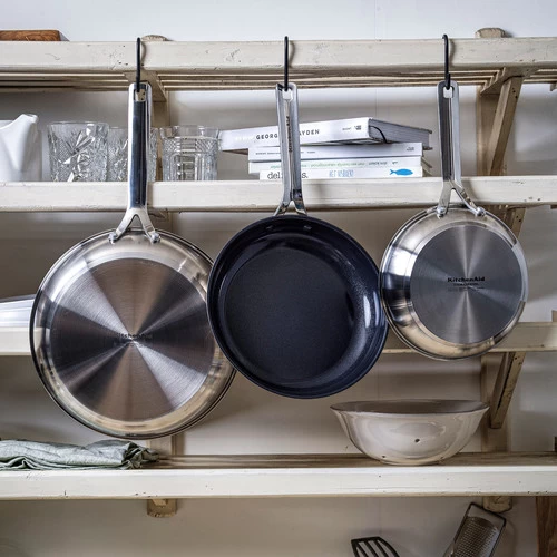 Met de KitchenAid Stainless Steel Koekenpannenset 20 + 24 + 28 cm haal je een basisset in huis voor het bakken van kleine en grote ingrediënten. De anti-aanbaklaag zorgt dat je weinig olie of boter nodig hebt en dat het eten niet aan de bodem blijft kleven. Bakken is daardoor een stuk gezonder dan bij vergelijkbare pannen die zo¿n laag niet hebben. Je gebruikt de koekenpannen op alle warmtebronnen wat betekent dat je deze pannen ook met inductie gebruikt. Wil je een gerecht in de oven garen of warm houden, dan kan dit tot 160 graden Celsius. Na gebruik mag de pan in de vaatwasser. Wil je dat de pan langer meegaat, dan was je hem het beste met de hand af.