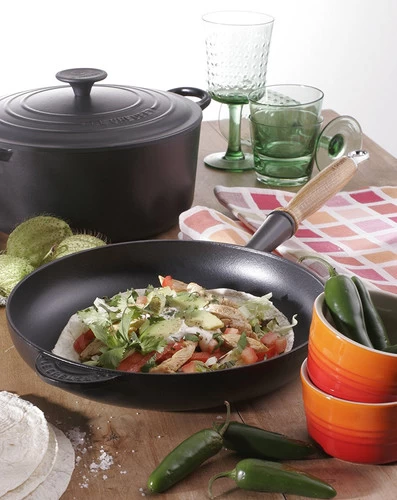 In de Le Creuset Gietijzeren Koekenpan 28 cm Mat Zwart maak jij gemakkelijk verschillende eenpansgerechten. De geëmailleerde gietijzeren pan is dankzij de dikke bodem een goede warmtegeleider. Je gebruikt de koekenpan op alle warmtebronnen, en de gladde binnenkant zorgt ervoor dat je weinig olie nodig hebt tijdens het koken. Hierdoor is je bereiding gezond én bakt je gerecht niet aan. Het houten handvat geeft veel grip, zo verplaats je de koekenpan eenvoudig naar de eettafel. Is iedereen uitgegeten? Dan maak je de koekenpan schoon met een borstel en wat afwasmiddel.