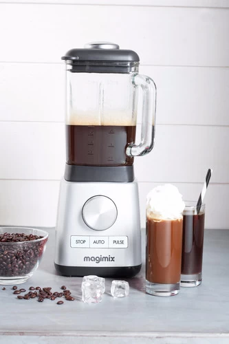 Met 1300 watt vermogen biedt de Magimix Power Blender 4 Mat Chroom 1,8 liter bovengemiddeld veel ‘power’ voor het vermalen van ijsklontjes en harde ingrediënten. Maar ga je met dikkere bereidingen aan de slag, roomijs bijvoorbeeld, dan draai je ‘m terug naar 600 rotaties per minuut. Weet je niet welke snelheid te gebruiken? Deze blender beschikt over 5 automatische programma’s zodat je bijvoorbeeld soep en smoothies met 1 druk op knop maakt. De glazen blenderkan van 1,8 liter is geschikt voor zowel koude als warme ingrediënten. Je maakt er dus een ijskoude milkshake óf een warm pompoensoepje in. Ben je klaar, dan schakel je het reinigingsprogramma in. Zo heb je geen omkijken naar de afwas.