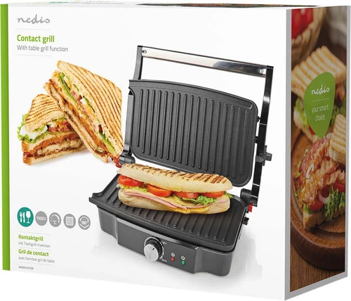 Je klapt de contactgrill helemaal open, zodat je ‘m ook als tafelgrill gebruikt.
