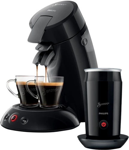 Zet direct een cappuccino met de Philips Senseo Original HD6553/65 Zwart met melkopschuimer. De melkopschuimer schuimt luchtig melkschuim op voor zowel warme als koude melkspecialiteiten. Zo tover je alle zwarte koffies om tot een cappuccino of zelfs tot ijskoffies. Met de Senseo zet je 1 of 2 kopjes koffie tegelijkertijd met een dikke en zachte cremalaag. Elke kop koffie heeft een vol aroma, dankzij de Koffie Boost technologie. Zo besprenkelt de koffiemachine eerst de koffiepad met heet water voordat het zetproces begint. Hierdoor heeft de koffie langer de tijd om smaak af te geven. Na het koffiezetten schakelt hij zichzelf na 30 minuten uit.