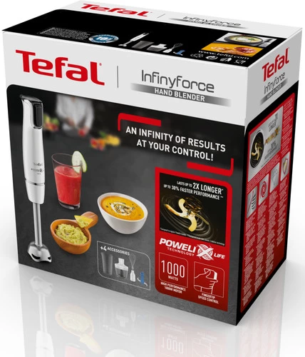 Met de Tefal InfinyForce 4-in-1 HB9441 haal je een krachtige staafmixer in huis waarmee je mixt, hakt, klopt en ijs crusht. Je krijgt er namelijk verschillende accessoires bij. Zo zit er een hakmolen bij voor het hakken van noten of snipperen van een uitje. Met de garde klop je slagroom of eiwitten op in de handige maatbeker. Voor het maken van ijskoude drankjes pak je het ijs crush opzetstuk erbij. De staafmixer is uitgerust met Powelix Life messen. Deze messen gaan lang mee dankzij de titanium coating. Zodra je harder op de multi-speed trigger snelheidsregeling drukt, mixt de staafmixer vanzelf sneller. De losse onderdelen zet je na gebruik gewoon in de vaatwasser.