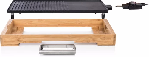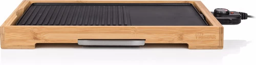 Dankzij de grote bakplaat is deze Tristar Bamboo Grill XL BP-2641 geschikt voor grote gezinnen van 6 personen. De bakplaat beschikt zowel over een geribbelde kant – lekker voor je biefstukje – als een vlak gedeelte. Maar wat je ook grilt of bakt, voor aanbranden hoef je niet bang te zijn. De gehele plaat is namelijk voorzien van een antiaanbaklaag. Door het hoge vermogen van 2200 watt is deze tafelgrill snel opgewarmd, en met de thermostaat aan het snoer regel je de temperatuur heel precies. Is iedereen uitgegeten, dan koppel je het snoer los en neem je de plaat uit. Zet ‘m in heet water, haal er een uurtje later een doekje eroverheen en uitbuiken maar.
